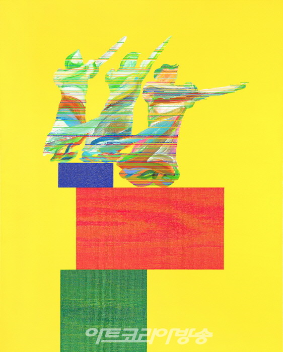 권성원의 2017년 이후의 작품 연보를 통틀어 칭하면 ‘이미지 뭉치/덩어리’ 쯤 될 것 같다. 스토리가 사라지고 기본 도형과 고전 도상이 뒤엉킨 하나의 뭉치/덩어리를 무작위인 듯 계획적으로 화면에 던진 모양새라고나 할까. 작가는 기본 도형들로 구성한 연작 회화 <형성 Formation>의 밑그림을 위해, 무작위로 쌓아놓은 실제 입체 도형들을 위에서 촬영한 사진을 참고자료로 썼다고 한다. 여기에 사용된 도형 가운데 원구 원추 원뿔이, 화가가 세상을 바라보는 기본 단위로 세잔이 예시했던 회화론의 영향 탓도 크겠지만, 권성원의 <형성 Formation>은 회화에 대한 자의식과 맞닿아 있다. 양손을 동시에 사용해서 회화를 제작하는 독창적이고 기계적인 화법이나, 그림에서 스토리를 밀어내고 표면의 실험에 집중한 점이나, 시각적인 재현보다 물감의 촉각적인 질감으로 무게 중심을 이동시킨 점 등, 2010년대 전후 미술판에서 대세로 떠오른 새로운 회화 또는 메타 회화의 한 유형으로 묶일 만하다.