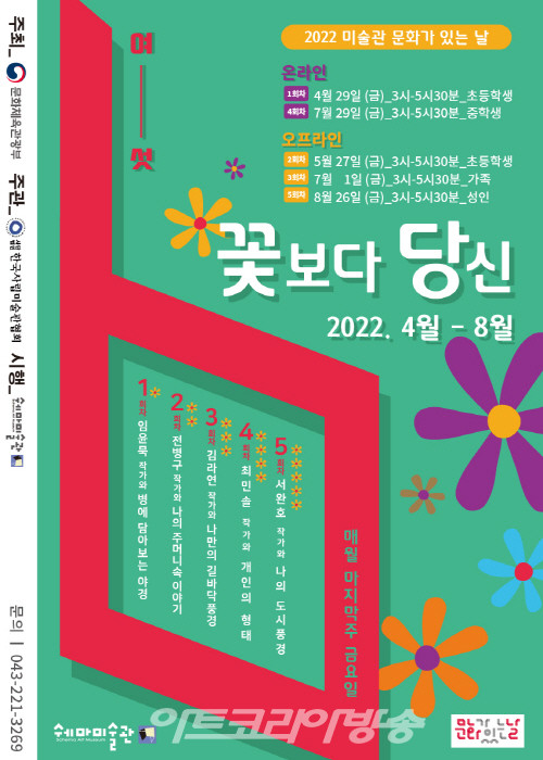 [아트코리아방송 = 김한정 기자] “꽃보다 당신”은 작가와 함께 작품 감상과 예술 체험활동을 통해 대상자들이 주체가 되어 미술을 감상하고 즐기는 ‘문화가 있는 날’ One Day 프로그램입니다. 쉐마미술관의 “꽃보다 당신”은 아름다운 꽃보다 일상 가운데에서 지쳐있을지도 모르는 당신이 더 아름답고 소중하다는 의미를 가지고 있으며, 여섯 번째 Season입니다.