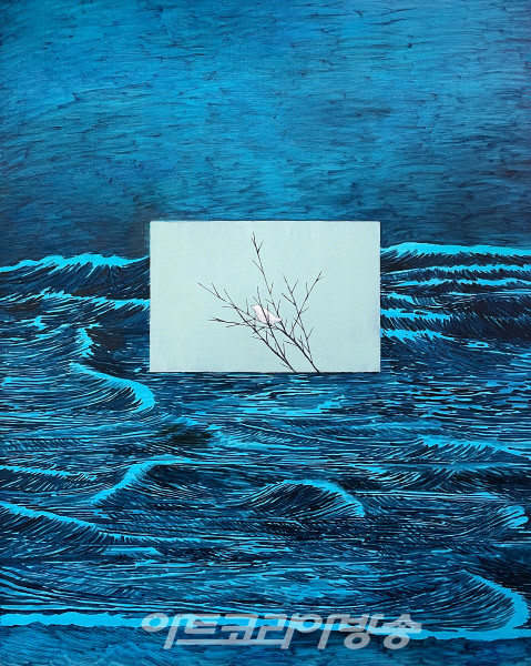 타원형 화면 안에 파도가 치고 있고 그 한가운데 불 모양의 실루엣을 한 인간이 서 있다. 크기는 작지만 마치 씨앗처럼 노형규의 작품을 이해하는 시작으로 적절하다. 신화 속 미의 여신이 파도의 거품에서 ‘자연스럽게’ 태어났다면, 서사성이 강한 작품들을 이끌어가는 이 남성 주인공은 파도와 맞선 불의 인간이다. 싸움이라고 하기에는 상대가 되지 않지만, 외력도 막강하고 직립한 존재의 의지도 강고해서 긴장감이 느껴지는 구도다. 아래를 향하는 물이나 위를 향하는 불은 그 물리적 양태 만큼이다 상극이다. 노형규의 작품에서 물과 불은 불가항력적으로 다가오는 외부의 힘과 이에 맞서는 주체로, 짝패를 이룬다. 또 다른 작품에서 인간과 파도의 만남은 파국적이다. 여기에서 인간에 비해 압도적인 파도는 단순한 물이 아니라 ‘나를 덮는 무언가’이다. 화면을 4개로 분할한 작품에서 푸른 파도는 빛을 받거나 타오르는 상징들과 나란히 하면서, 대조적인 상징군을 도해한다. 작가는 물질적 상상력을 발휘한다. 바슐라르에 의해 유명해진 ‘물질적 상상력’은 상징이라는 관념을 시각화하기에 용이한 면이 있다.