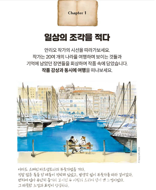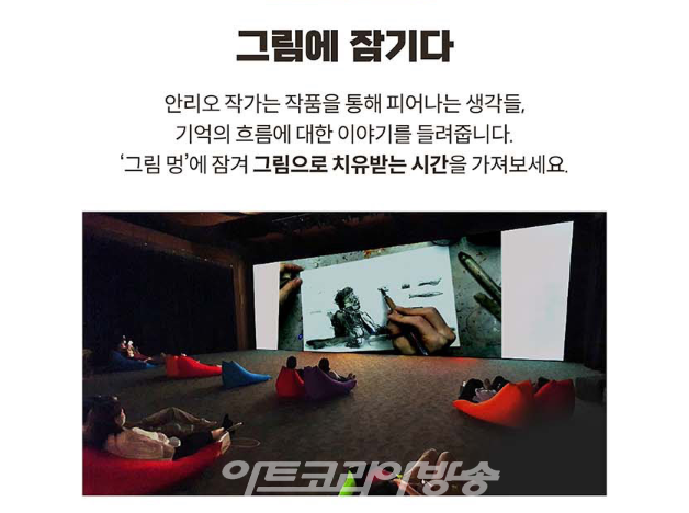 일상의 생각을 작품으로 표현한 안리오 작가 작품은 시 집, 수필, 판타지 등 다양한 장르의 책을 읽는 느낌을 주고 있으며, 재미있는 에피소드들이 담긴 작품을 통해 기존의 보고 느끼기만 했던 작품 감상법이 아니라 다음 장이 궁금해 책장을 넘기고 싶은 새로운 감상으로 예술을 즐길 수 있는 전시의 장이 될 것이다. 전시는 무료 관람으로 진행한다.