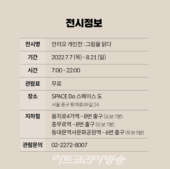[아트코리아방송 = 김종숙 기자] 2022년 07월 07 ~ 2022년 08월 21일까지 스페이스 도(SPACE Do, 서울 중구 퇴계로49길 24)에서 그림을 읽다 - 안리오 개인展이 개최된다.