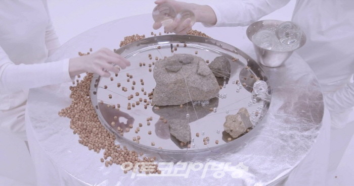 SF적인 서사로 짜인 내레이션과 안무가들이 사물을 이용하여 섬세한 소리를 내는 퍼포먼스 영상 이수진의 <아울러프로덕션>(2021)은 보이지 않아도 세상을 움직이는 작은 존재들의 가치에 주목한다. 작가는 자연에 존재하는 아주 작고 미비한 존재들을 소외시키지 않고 화합과 조화를 이루었을 때 인류가 직면한 전 지구적 문제를 해결할 수 있을 것이라는 메시지를 전한다.