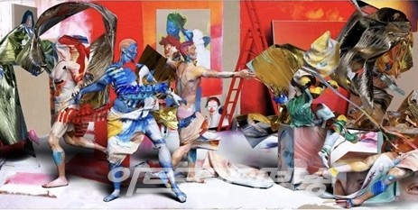 "Stone의 대규모 작품 중 하나인 The Red Studio는 Nicolas Poussin의 A Dance to Music of Time에서 일부 구성을 차용한다. 그림은 Stone의 표현력 있는 페인트와 아바타로 분주하다. 푸생의 17세기 걸작 Red Studio의 제목과 붉은 벽은 Matisse의 1911년 그림 L'Atelier Rouge를 떠올리게 하여 Matisse의 주제와 Poussin의 춤 사이의 연관성을 상기시킨다. 이 작품은 전시의 많은 작품과 마찬가지로 물리적 조각으로 제작될 뿐만 아니라 The Basement Studio와 The Blue Studio라는 두 개의 다른 작품에서도 나타난다.이 재생산 과정은 여러 예술 역사적 실을 무너뜨리고 인정하여 영향력의 네트워크로 결합한다.
