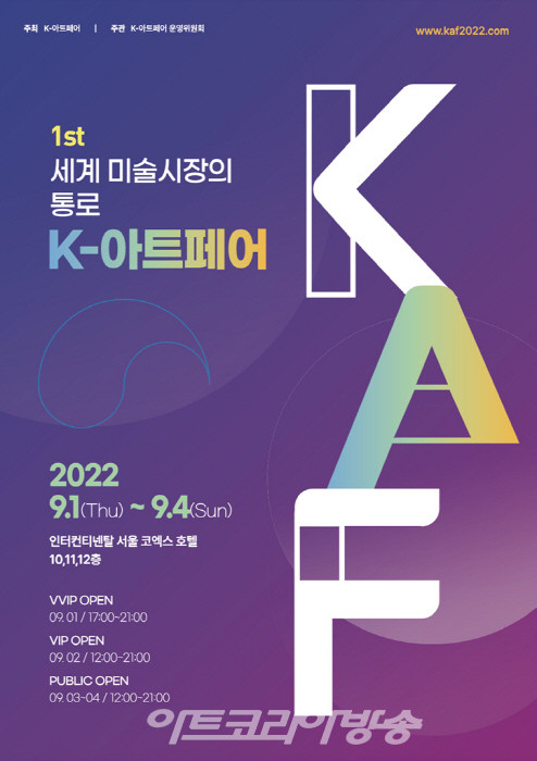 [아트코리아방송 = 김성수 기자] 2022년 현재의 한국미술 작품세계와 콜렉터 그리고 일반 관람객들의 미술품 구매 성향을 파악할 수 있는 'K-아트페어'가 오는 2022년 9월 1일(목) ~ 9월 4일(일)까지 서울 인터컨티넨탈호텔(10.11.12층)에서 개최된다. ‘K-ART FAIR’는 82개 룸에 70여개 갤러리가 참여해 유명작가 원작을 포함해 청년작가, 중견작가, 원로작가 작품 약 2,000여 점이 전시된다. 호텔 객실이 전시장 되어 갤러리 소속으로 참가한 작가들의 미술품이 관람객들에게 문화예술향유의 기회를 제공하고 취향에 맞는 작품을 선택 구매하여 소장할 수 있는 기회를 주고 있다.