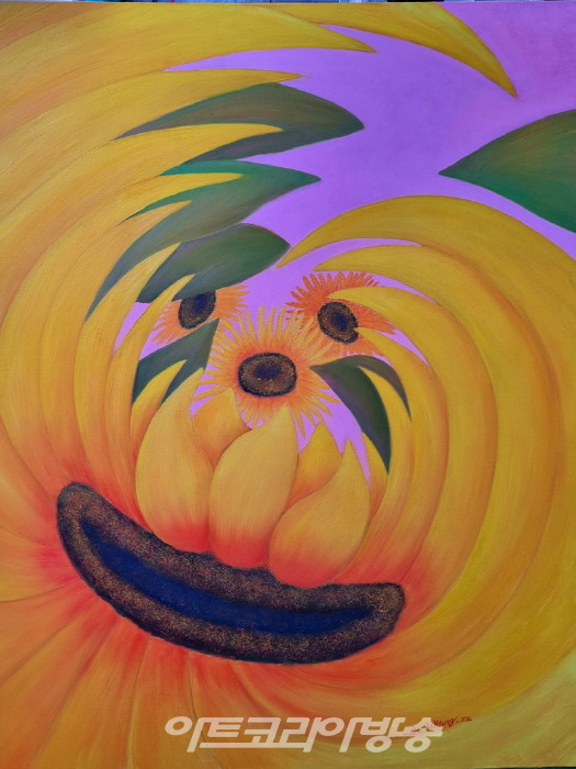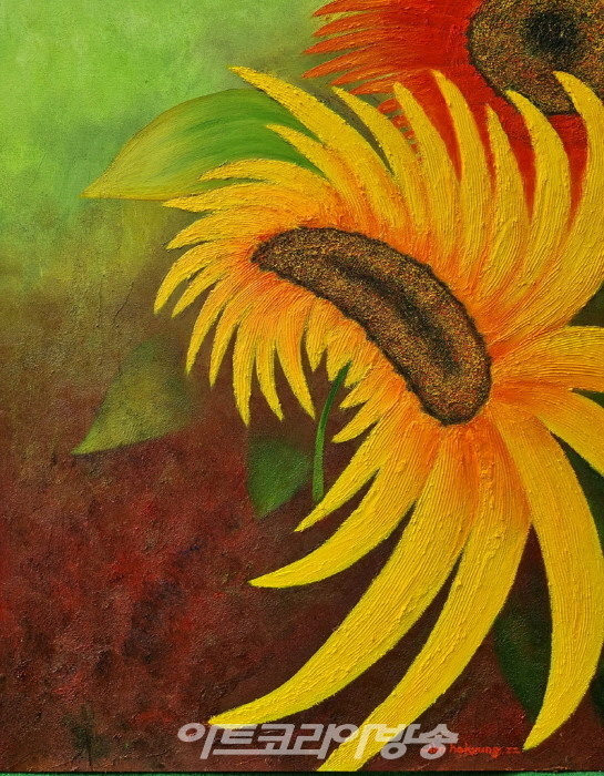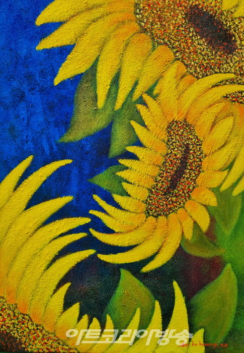 많은 작가들이 해바라기를 소재로 작품을 완성하지만 부여되는 철학과 사상은 모두 다르다. 작가는 매일 마주하는 태양과 해바라기를 동일선상에 놓고 생명의 근원인 태양이 캔버스에 담겨 삶에 활력을 얻고자 한다. 태양은 해바라기가 되어 미소를 짓거나 어머니의 마음과 같은 포용의 힘으로 위로가 되기를 바라고 있다. 복을 나누듯 해바라기 그림을 많은 관람객에게 공개하여 심신의 안정을 찾는 휴식의 시간이 되기를 기대한다. 웃음을 보내듯 환한 해바라기 꽃 그림으로 작가와 관람객이 느낌을 서로 공유하고 이야기 나누는 힐링의 시간을 만들어 간다.