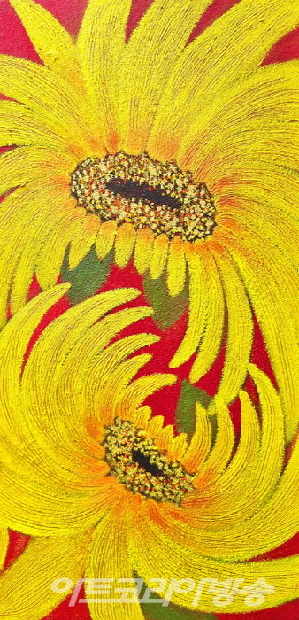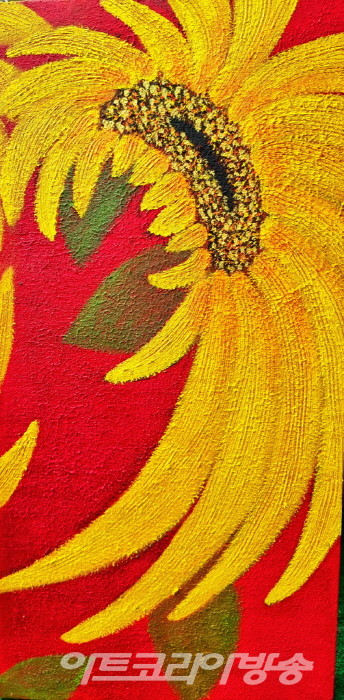 보았던 해바라기를 상상하며 관념적인 꽃그림을 표현하고 있는데 꽃잎을 더 크고 화려하게 만들어 시선을 모으고 있다. 태양의 핵심 상징인 열정과 빛나는 역동적인 힘 그리고 굳건한 희망을 표출하는데 심혈을 기울였다. 화면 중심으로 곡선의 힘 있는 움직임의 확장과 집중은 개인, 가정, 사회의 강건함을 기원했다. 노란색의 해바라기 본연의 색채에서 확장성 있는 주황과 주홍에 이르는 근접색을 활용하여 단조로움을 줄이고 열망과 열정으로 일상을 살아가려는 의지를 확고히 했다.