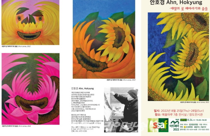 '태양의 꽃 해바라기와 춤을' 작품으로 전시를 하는 안호경 작가는 "태양을 만날 때면 환희에 찬 광경이 새롭게 힘을 얻는 원천이 되어 그 기운을 해바라기 작품에 담아 행복을 찾아가는 매개체로 삼고자 했다. 해바라기는 태양의 꽃이기도 하지만 숭배의 대상 그리고 물질의 풍요이며 동경과 기다림의 상징으로 따뜻한 감성이 관람객들에게 느껴지길 바란다."고 말했다. 작가는 개인전 8회, 단체전 160여회 진행한 중견 작가로 광진미협 미디어분과위원장, 한국녹색미술회집행위원장, 한민족미술협회 사무총장 등 한국미술 발전에도 활동을 적극적으로 하고 있다.