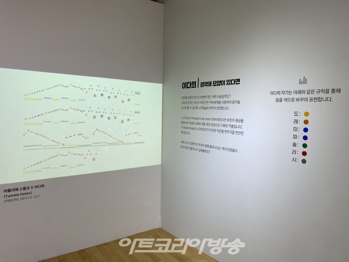 첫 번째 섹션 <음악에 모양이 있다면>은 음악을 시각예술로 번안하는 작업을 이어온 이다희 작가가 바흐의 곡을 바탕으로 한 40개의 회화 연작<J.S.Bach-Prelude in eb minor BWV853>(2021)과 모차르트의 작은별 변주곡을 시각적으로 번안한 영상 작품 <Twinkle Notes>(2021)이 전시된다. 전시장 내 준비된 QR코드를 통해 관람객이 실제 음악이 어떻게 시각적으로 구현되었는지 비교해 볼 수 있도록 했다.