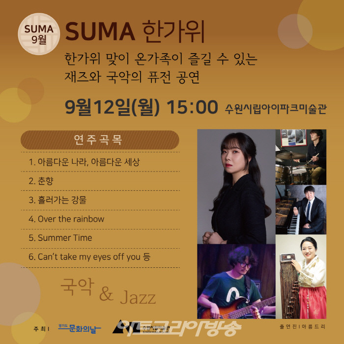 추석 연휴 마지막 날인 9월 12일(월)에는 수원시립아이파크미술관 로비에서 온 가족이 함께 즐길 수 있는 무료 공연으로 재즈와 국악 퓨전밴드 ‘아름드리’가 <아름다운 나라>, <춘향>, <Over The Rainbow> 등을 연주한다.