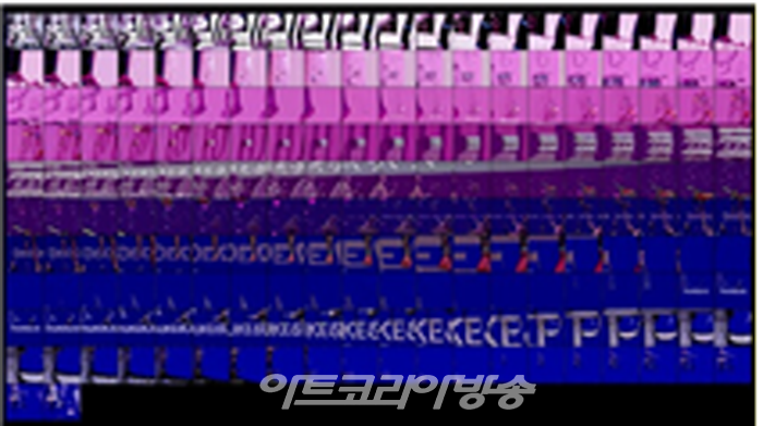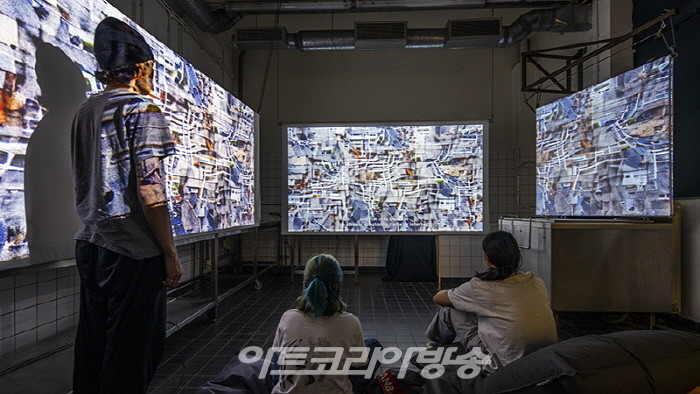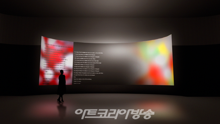 <002 이제 나는 죽어가는 햇살이 나를 데려가는 것을 느끼며> 작품은 두 시인의 작품을 학습한 AI가 이를 3개의 대형 스크린에 이미지로 보여준다. 두 시인은 시 본분에 문자, 도형 등을 그림 형식으로 배열한 구체시(具體詩)를 쓴 작가이다. 이 점에 착안해 구체시의 방법 일부를 적용한 미디어아트 작품을 탄생시켰다.