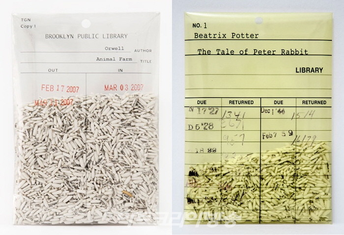 나는 몇 달 전에 마이애미 펄스에 있는 몬테네그로의 Mc2 갤러리 에서 베트남계 미국인 예술가 Trong Gia Nguyen의 일련의 "책"을 수집했습니다 . 작품은 투명 플라스틱으로 만든 작은 봉투와 각 책과 관련된 도서관 카드를 모방한 스크린 인쇄로 구성됩니다. 작가는 확대 렌즈와 바늘, 먹으로 책의 전체 또는 일부를 쌀알 하나하나에 세심하고 공들여 필사했습니다. Allen Ginsberg 의 Howl , Beatrix Potter 의 The Tale of Peter Rabbit , George Orwell 의 Animal Farm 을 구입했습니다 . 쌀 한 알도 잃지 않도록 운반할 때 매우 조심하고 있습니다.