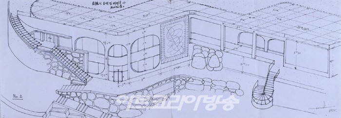 한편 전시에서는 문신의 드로잉도 만나볼 수 있다. 과거 창원시립마산문신미술관 건축을 위한 구상 및 설계 드로잉, 평면도 등이 400여 점 이상 전해진다. 초기 아이디어 스케치에서부터 경사진 지형에 대한 충분한 이해를 바탕으로 조경까지 섬세하게 묘사한 완성도 높은 드로잉까지 문신의 미술관 건축 드로잉은 그 자체로 아름다울 뿐만 아니라 그의 건축적 역량을 드러내고 그가 꿈꾼 ‘미술을 위한 전당’을 만들기 위한 모든 과정을 포함한다는 점에서 유의미하다. 특히 대칭과 함께 동일한 패턴의 무한 반복과 확장이 만들어내는 수학적 아름다움을 마음껏 펼친 바닥 드로잉은 백미로 꼽을 수 있다.