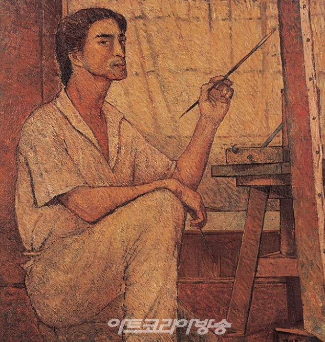 ‹자화상›은 도쿄 일본미술학교에서 서양화를 공부하던 시절 그린 작품으로 해부학에 근거한 인체 표현과 자연스러운 색감의 온건한 화풍을 보여주며, 화면을 과감하게 나누는 구도나 인물의 시선이 인상적이다. 작가가 남긴 기록에 따르면 재야 공모전인 이과전(二科展)에서 떨어지고 그 이듬해 제작한 작품으로 20대 초반의 조선인 청년은 자신을 마치 타인의 평가에 아랑곳하지 않는 중년의 거장처럼 묘사했다. 당시 전국 각지에서 상경한 예술인들이 거주하는 ‘이케부쿠로(池袋) 몽파르나스’ 예술인촌에 머물며 작업하던 작가가 민족적 정체성보다 화가로서의 정체성을 중시했음을 감지할 수 있다.