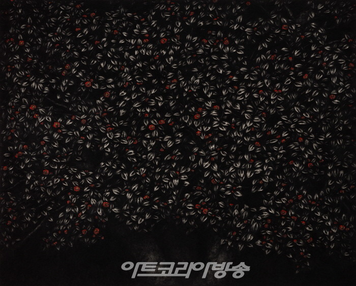 지난 20년 전부터 태양의 스펙트럼 빛을 외면하고 칠흑의 어두운 밤 달빛을 화두로 음(陰)의 예찬론자가 되어 응달을 탐미하며 살았다. 적막한 밤기운이 머무는 곳에서 뇌리를 스쳤던 사물의 모티브나 소재를 달빛의 매개체로 앞세우고 목탄으로 채색해 은밀한 변신을 계획한 것이 지금의 달빛녹취록(Moonscape) 테마작업이다. 목탄은 나무를 태워서 숲의 영혼을 표현하는 사리이다. 나뭇가지가 자기 육신을 태워 환생하니 내 작품에서는 살이고 뼈인데 그 검음은 달빛색채이며 삼라만상 숲과 나무들이 자태를 드러내려고 빛을 기다리는 검은 공간이다. 칠흑의 밤은 달빛소리와 기운, 냄새를 함께 동반하는데 눈으로만이 아닌 몸의 모든 오감을 동원해야지만 볼 수 있다. 시각(확연하게 보이지 않는 눈), 청각(바람, 풀벌레 소리), 후각(숲, 공기 냄새), 촉각(습한 공기의 살갗에 부딪힘), 육감(직관으로 느끼는 촉수) 등등 내 그림은 심상의 풍광을 펼치는 몸짓이며 근원의 감성 찾기이다.