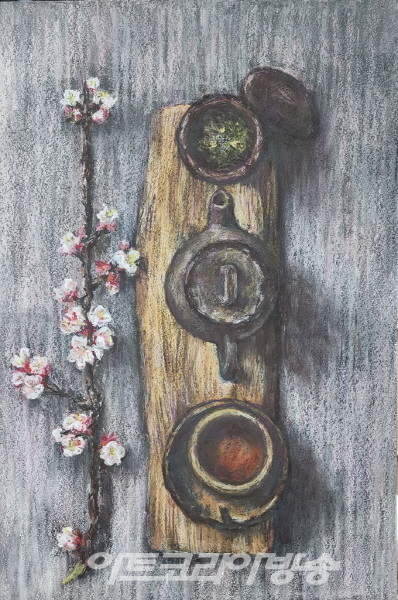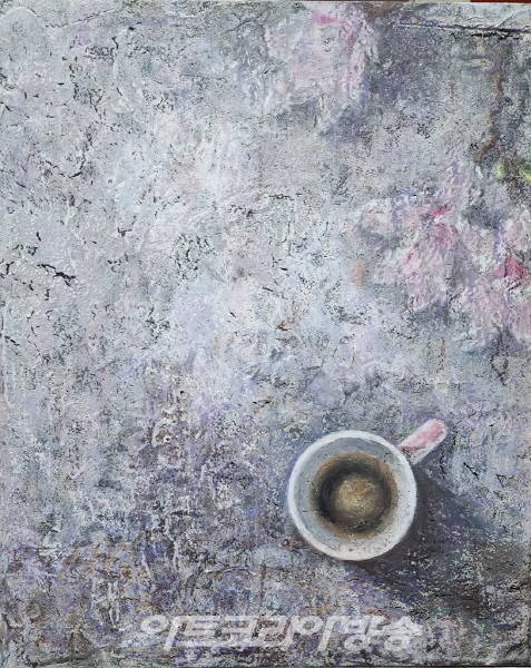 '향기 가득' 그림은 몽환적인 배경의 느낌이 아련한 무언가를 떠올려주며 놓인 찻잔의 향기가 공간을 가득 채운다. 또한 향기에 취해 그 사람과 함께 마주 앉아 차를 마시며 잔잔한 행복의 시간을 만든다. 그릇과 공간의 배경 그리고 여백과 채움의 미학이 화면 가득 채워져 평화로운 아침 호수를 바라보듯 힐링의 기운이 대단하다.