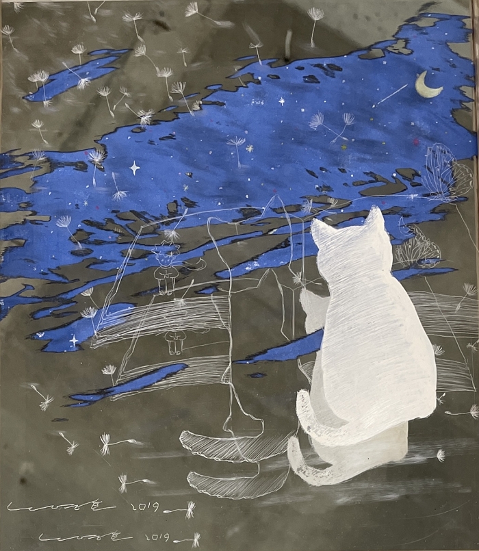 한해숙 화가는 바다처럼 푸른 눈동자를 가진 하얀 고양이가 모든 그림의 중심에 있다. 목표 지향적인 삶의 무게에 사라지는 일상의 소소한 이야기의 교차점에 단상 고양이를 매개체로 대중들과 소통하길 원한다. 그림에 쌓이는 시간과 그림을 보는 관람객의 시간이 쌓여 새로운 이야기가 기대되는 작품이다.