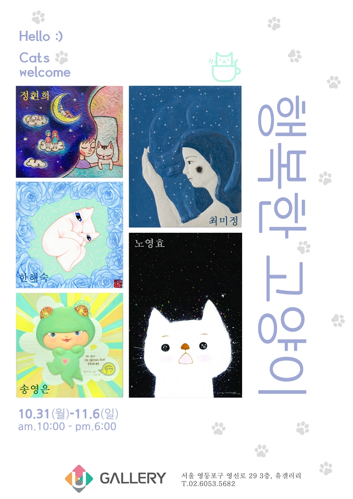 [아트코리아방송 = 박시유 기자] 신진작가와 청년작가에게 기회를 주고 전시를 도와주는 ‘유갤러리’가 고양이작가들을 초대하여 전시를 진행하고 있다. 고양이를 작품에 넣어 자기만의 세계를 담고 있는 화가들을 모아 자유롭고 행복한 고양이 작업을 소개한다.