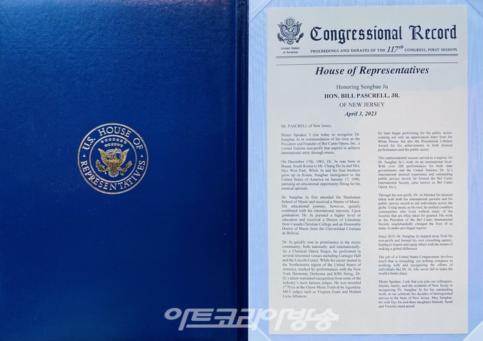 [아트코리아방송 = 김종숙 기자] 2023년 4월 3일 아름다운 음악을 통한 국제사회의 하나 됨을 이루기를 열망하며 비 정부 기구인 벨칸토 인터내셔널 소사이어티(벨칸토 오페라단)를 설립한 회장 주성배 박사의 200여회 공연과 공익 서비스의 공로에 대해 미 연방 하원 차원에서 그를 치하하고 상을 수여하기 위해 이 자리에 섰다.