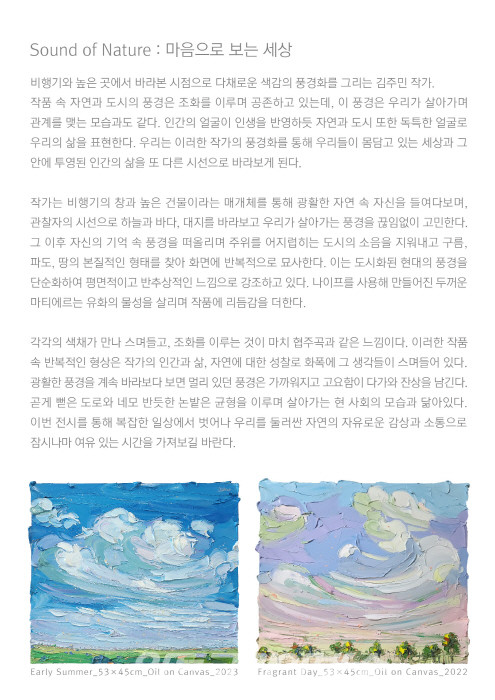 [아트코리아방송 = 김한정 기자] 아트코드갤러리는 김주민 작가의 개인전 <Sound of Nature : 마음으로 보는 세상>을 2023년 8월 1일부터 8월 25일까지 진행한다.