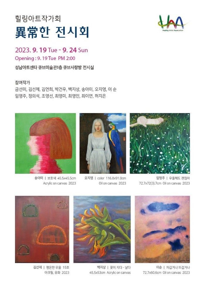 [아트코리아방송=백지연기자] 성남아트센터 큐브미술관 1층 큐브사랑방 전시실에서 조금은 특별한 전시가 열리고 있다. HAA(힐링아트작가회)주최로 15명의 작가가 참여하여 열리는 이번 전시는 서양화가, 상담심리전문가와 예술치료전문가가 콜라보하여 각자 '자신 안의 이상심리'를 테마로 하여 트라우마, 강박증, 우울증, 나르시시즘, 상실감, 갈등, 감정기복 등이 위트있게 예술작품으로 표현되어 자세한 작가노트와 함께 전시되고 있다.