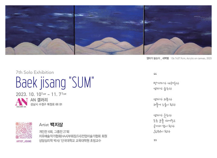 경기도 성남시 수정구 복정동 686-3 B1 AN 갤러리에서 10월 10일부터 ~ 11월 7일까지 백지상 작가의 7번째 개인展 ‘SUM’이 열리고 있다.