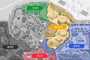소마미술관Red Zone-소마 미술관을 중심으로 위치하는 작품Blue Zone-컨벤션 센터 , 올림픽홀, K-아트홀 등 공원 내 부대시설 중심으로 위치하는 작품Yellow Zone-공원 내 경기장을 중심으로 위치하는 작품Green Zone-88호수, 피크닉 광장 같은 자연환경 위주로 위치하는 작품Black Zone-올림픽회관과 평화의 문을 중심으로 위치하고 있는 작품