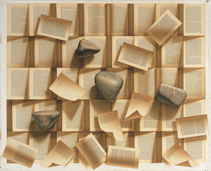 현실의 책 위에 돌에서 달항아리까지-'고영훈'고영훈의 작품에 돌이 중요한 소재로 등장하기 시작한 것은 1974년경이다. 작가는 당시의 군사문화를 상징하는 현실적인 군화나 자연적인 것을 상징하는 대표적인 오브제로 돌이 등장했다.그 돌은 극사실 기법으로 캔버스 위에 정밀하게 표현되었고 그 재현의 형식은 고영훈이 가지고 있는 극사실화법으로고영훈을 세상에 유명하게 만들었다.하나의 회화적 오브제로 간주하였던 그의 돌들은 1980년대부터는 정교하게 배치된 책 위에 놓여 극명하게 노출됨으로써 현실과 이상이라는 일치될 수 없는 공유의 공간 속에