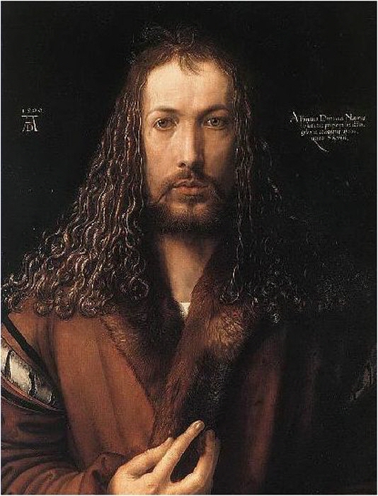 나이 28세 때에는 이미 원숙한 이미지의 독특한 자화상으로 자신의 존재를 부각시켰다. 그런데 자신을 예수로 신격화했다는 논란이 있었다. 뒤러는 20세기의 베르나르 뷔페(Bernard Buffet)처럼 20대에 이미 부와 명성을 모두 얻은 화가였다. 그런 자신감 때문인지 모피 소재의 고급스러운 외투를 입고 다갈색의 머리카락에 붉은 수염의 자화상은 마치 예수 모습을 패러디한 듯하다. 종교적인 확신에 찬 자화상은 특별했는지 뉘른베르크 시의회에서 구입을 하여 19세기 초까지 공개 전시되었다.