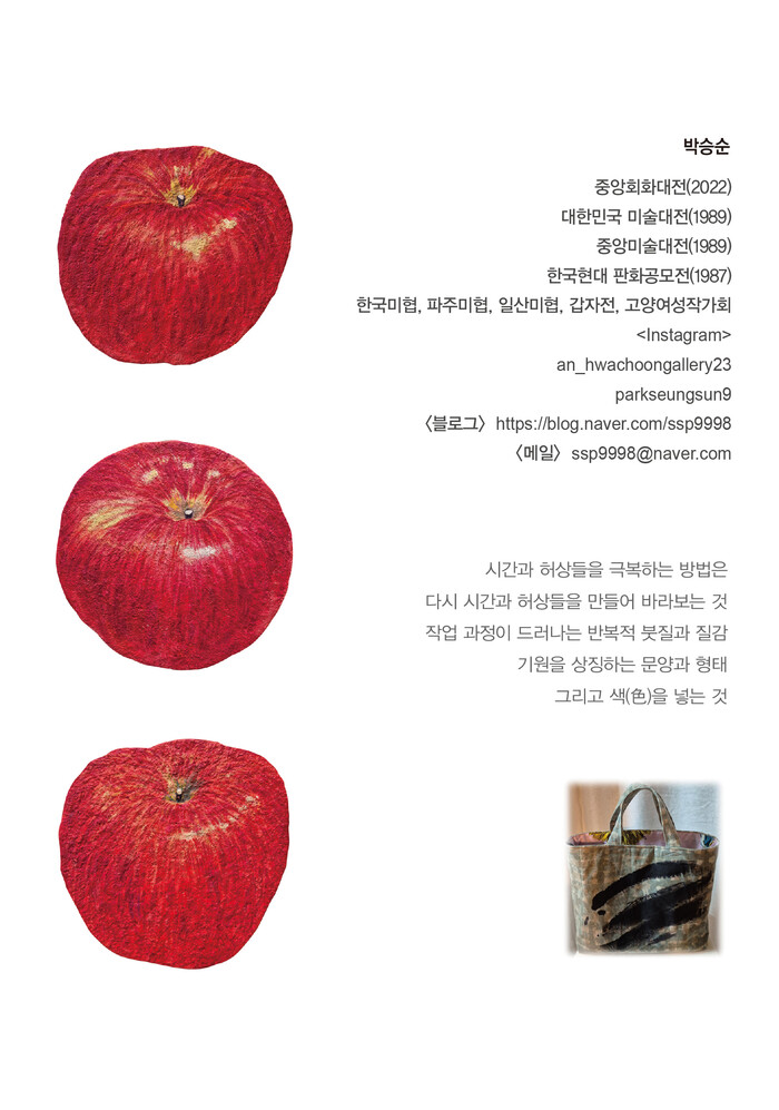 박승순 작가는 2000년 1회 개인전을 시작으로 2019-2022 ‘화가의 가방’ ‘화가의 사과’ ‘화가의 공간’ ‘기억학습’ 등의 전시를 통하여 성찰, 희망과 행복을 주제로 작품을 발표하고 있으며 .박승순 작가는 2000-2024까지 다수의 수상 격력과 단체전. 임원전. 회원전 다수의 개인 전시를 통해 작가의 작품을 알리기 위서 활발한 활동하고 있다.