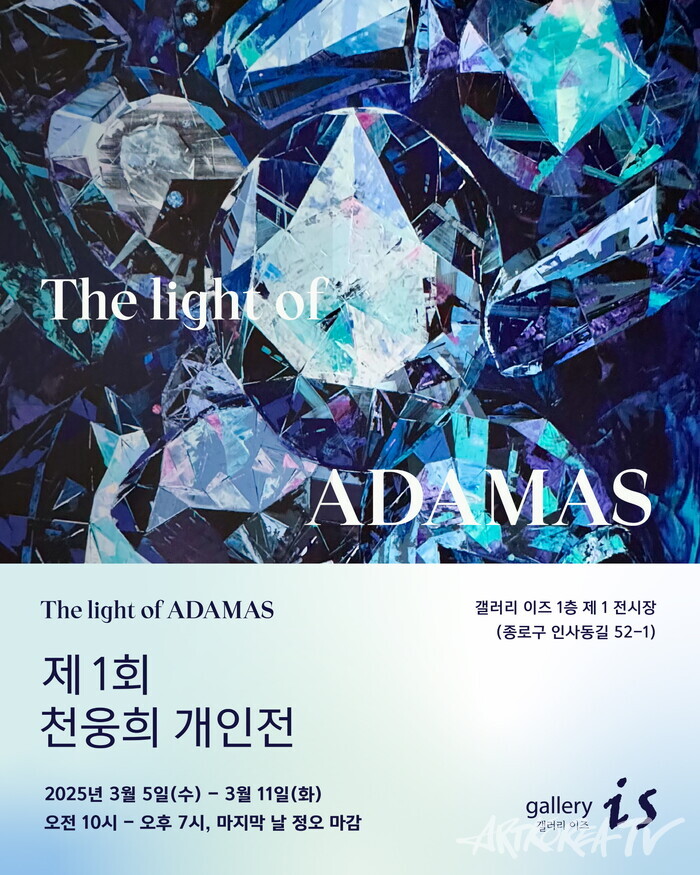 [아트코리아방송 = 황성욱 기자] 오는 2025년 3월 5일부터 3월 11일까지 인사동 갤러리 이즈 제1전시장에서 천웅희 작가의 첫 개인전 “The Light of ADAMAS"가 열린다. 이번 전시는 작가가 다이아몬드를 매개로 인간 존재의 본질과 회복을 탐구하는 작품들을 선보인다. 천웅희 작가는 이번 개인전을 통해 "다이아몬드는 단단하고 빛나지만, 동시에 빛을 받아야만 그 아름다움을 드러낼 수 있다"는 메시지를 담아냈다. 생명의 탄생과 소멸, 그리고 존재의 의미를 탐구하며, 작품 속에서 인간이 자신의 본질을 어떻게 재구축하는지를 다룬다.